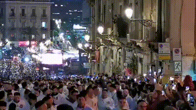 I ceri illuminano la notte, i fedeli sono inginocchiati. Qualcuno non ha più voce, tutti sono ricoperti dalla cera. L' attimo di silenzio è rotto dal richiamo che tutti conoscono: «Cittadini semu tutti devoti tutti? Cettu, cettu». E' un coro unanime, un grido d'amore per la nostra patrona. Un devoto viene aiutato dagli altri a mettere un mazzo di fiori sull'altarino. Partono gli applausi scroscianti. Ci si ferma ancora qualche istante in adorazione. Al segnale si riprende in spalla la cera e si prosegue per via Garibaldi. «Quanto manca? Dov'è la Santa? Piazza Risorgimento? Via Aurora? » E' un tam tam con i cellulari, un passaparola continuo tra la gente della "Palestro". Tra loro ci sono le coppie di fidanzati Danilo e Deborah, Dario e Jessica: «Rispetto al passato il fercolo è in notevole anticipo - dice Danilo - nel 2011 arrivò in piazza alle 5 di mattina. Adesso non vediamo l'ora di vederla per ringraziarla e per chiederle una grazia».