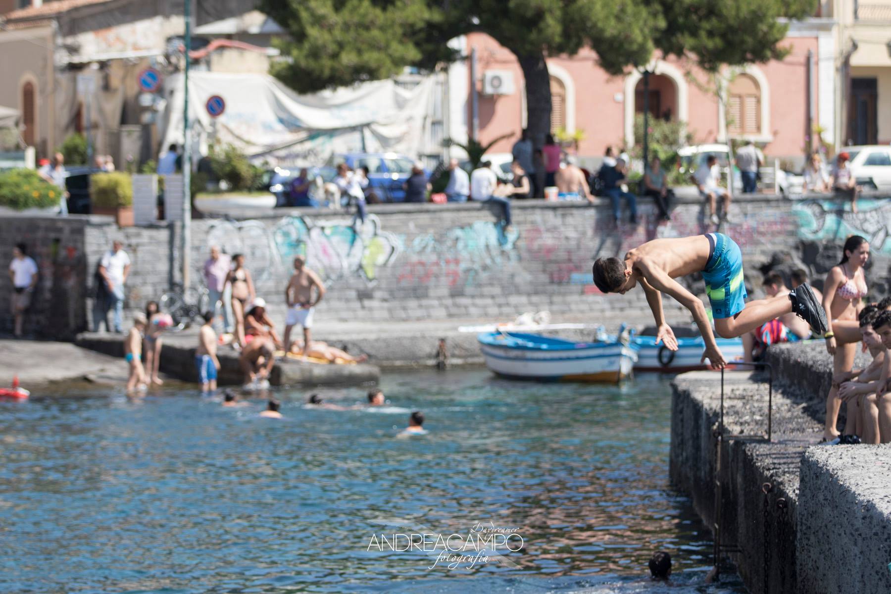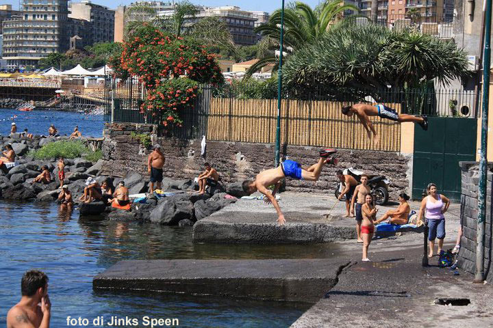 Anche se non ha tradizioni marinaresche come Genova, Venezia e altre grandi città di navigatori, Catania è una città di mare a tutti gli effetti e i suoi abitanti, fin da tempi remoti, nascono direttamente col piede marino. Se appena nati li metti a mollo galleggiano subito. Come se, oltre l'aria, per respirare avessero bisogno anche dell'acqua marina. E' una delle poche grandi città italiane ad avere tale privilegio, questo contatto così vicino al mare. Certo, anche Bari e Napoli hanno il lungomare in città, ma provate a farci il bagno. E poi, stare a mollo nelle acque della sua scogliera, così trasparenti e profumate mentre magari vedi tua moglie o tua madre che puliscono il balcone di casa, e poi risalire ancora umidi sul lungomare che sei già in Centro o, al limite, prendere l'autostrada in direzione di Giarre per salire in dieci minuti sull'Etna. Credetemi è una cosa davvero esclusiva. Per chiarire il concetto, la balneazione proprio sotto casa. Ma dentro la città. A "calata" a mare. di Mimmo Rapisarda